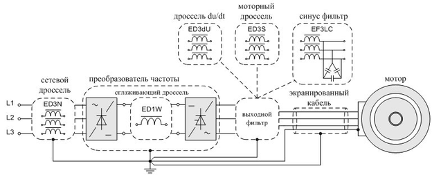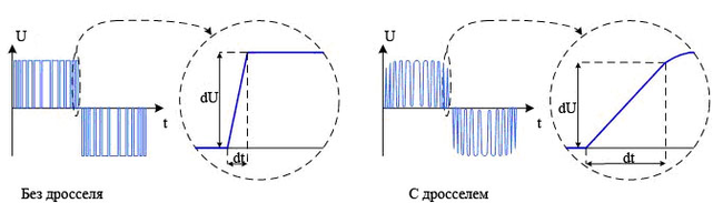 Моторные дроссели имеют более высокую индуктивность и поэтому могут работать при большой длине кабеля и большой частоте переключений. Это чаще всего применяемое и успешное устройство, которое защищает двигатель от негативного влияния ШИМ преобразователя частоты.