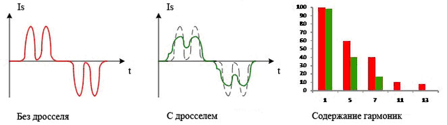 в части снижения гармонических искажений напряжения сети примерно такая же, как и линейных дросселей переменного тока.
