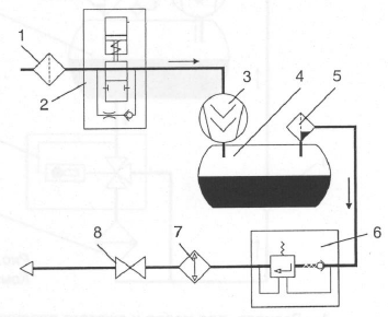 1 – фильтр всасывания; 2 – регулятор всасывания; 3 – компрессорная ступень; 4 – ресивер для сжатого воздуха и масла; 5 – маслоотделитель; 6 – обратный клапан давления; 7 – дополнительный охладитель сжатого воздуха; 8 – запорный клапан.