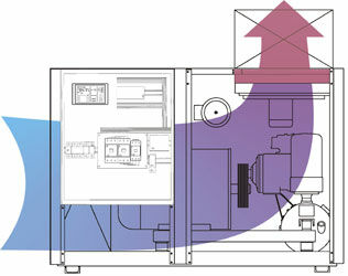 Затем, часть поступающего воздуха всасывается воздушным фильтром, а другая часть направляется вентилятором на охлаждение масляного и воздушного теплообменников. Теплообменники расположены горизонтально, в верхней части корпуса, непосредственно над крыльчаткой вентилятора. Благодаря такому расположению вентилятора и теплообменников, как при работающем вентиляторе, так и в режиме ожидания используется эффект перемещения более теплых масс воздуха вверх.