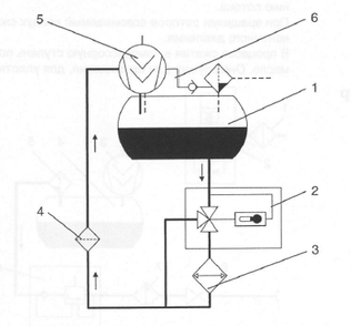 1 – ресивер для сжатого воздуха и масла; 2 – термостатический регулировочный клапан для масла; 3 – масляный радиатор; 4 – масляный фильр; 5 – компрессорная ступень; 6 – дренажная линия.