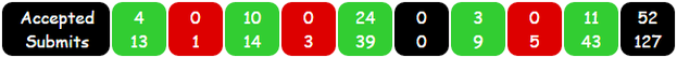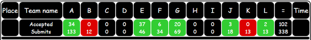 Некоторые из цветов, представленных на рисунке 3.6, используются в заголовке таблицы результатов. Зелёный цвет используется для задач, по которым есть хотя бы одна удачная посылка, в то время как красный цвет для задач, по которым есть хотя бы одна неудачная посылка (рисунок 3.8).