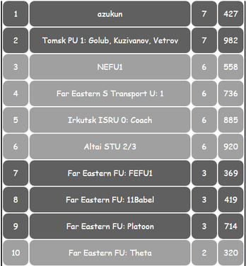 – место участника. Стоит отметить, что если два участника решили одинаковое количество задач с одинаковым штрафным временем, то они занимают одно место;