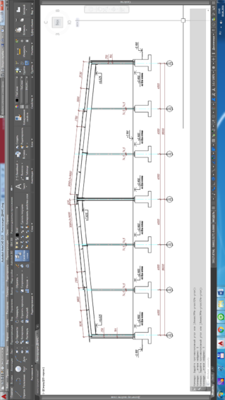Поперечные рамы с жестким закреплением колонн к фундаментам. Коньковый узел рамы – жесткий на фланцах и высокопрочных болтах. Продольные связи заданы гнуто-сварной трубы предварительным сечением 140×5. Связи устанавливаются в осях 11 – 12 (примерно середина здания) по каждой продольной раме. Каркас – стальные конструкции. Колонны – предварительно заданы из двутавра 35Ш1 по СТО АСЧМ 20-93, балки покрытия – двутавры 60Б1.