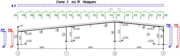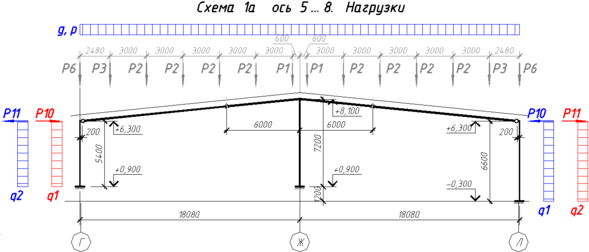 Рисунок 2.3 – Схема приложения снеговой и ветровой нагрузки на раму Рм1