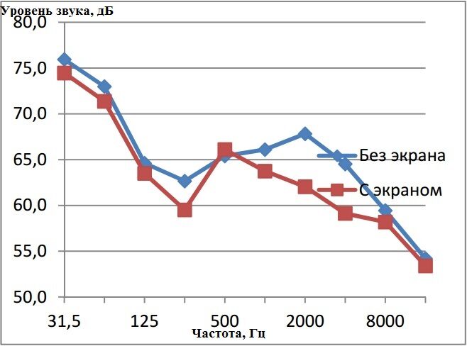 Рисунок 4.7 Эффективность акустического экрана Soundim при проезде поезда по 1-му пути