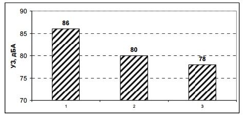 Рисунок4.2 Уровни звука грузовых вагонов, оборудованных различными тормозными системами на расстоянии 25 м и скорости 100 км/ч 1 – колодочные тормоза (чугунные колодки), 2 – колодочные тормоза (композитные колодки), 3 – дисковые тормоза