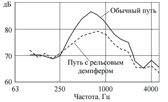 Звукоизоляция, вибродемпфирование и виброизоляция рельса. Снижение звукоизлучения рельса достигается установкой вибродемпфирующих накладок на шейку рельса [28], средством ближней звукоизоляции является акустический экран устанавливаемый там же [29]. Виброизоляция рельса достигается установкой прокладок под рельс.