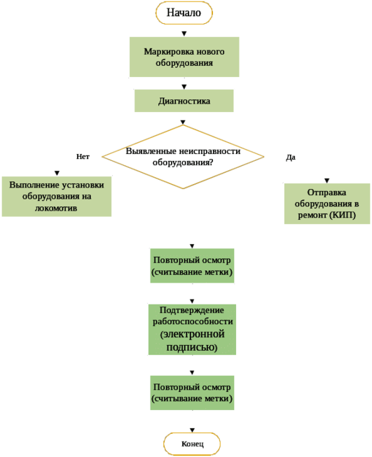После считывания метки, делается заключение о сроке службы и исправности приборов. Если прибор исправен и удовлетворяет всем нормам, то электромеханик производит подтверждение электронной подписью. При этом фиксируется время окончания работы на данном устройстве. Если же прибор неисправен или просрочен по сроку службы, электромеханик производит замену прибора, а неисправный прибор отправляет в ремонт. При обнаружении на пункте технического обслуживания неисправности системы безопасности, устранение которой невозможно за время, отведенное на проведение технического обслуживания, работник, обслуживающий устройства безопасности обязан запросить постановку ПС на внеплановый ремонт с изъятием из эксплуатации до устранения неисправности.