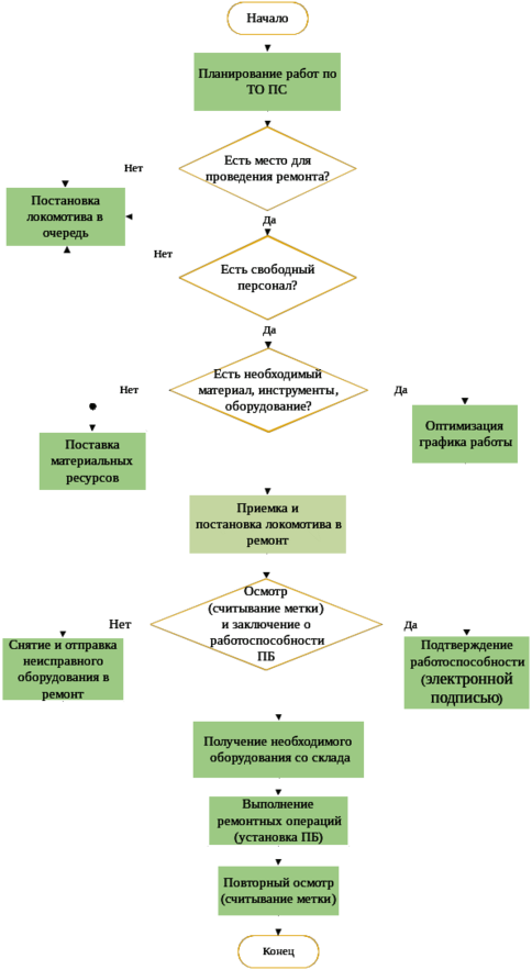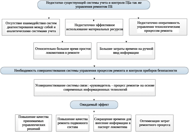 Процесс диагностики и ремонта начинается с планирования работ по техническому обслуживанию подвижного состава. Далее эта информация поступает диспетчеру по управлению. По приходу сообщения о подходе локомотива к локомотивному депо, начинаются мероприятия по подготовке процесса ремонта (согласуется наличие свободного стойла, материалов, оборудования, персонала, считывание электронного паспорта локомотива из сети ОАО «РЖД», операционное планирование процесса ремонта и так далее). При заходе локомотива в депо, цех ремонта уже готов принять его в ремонт или поставить его в очередь