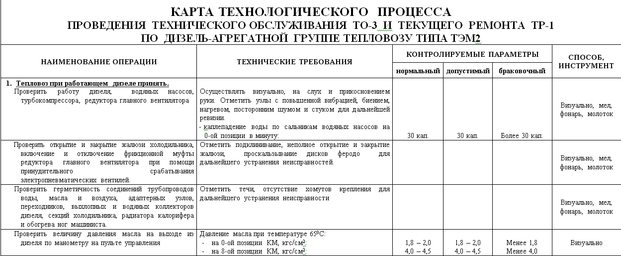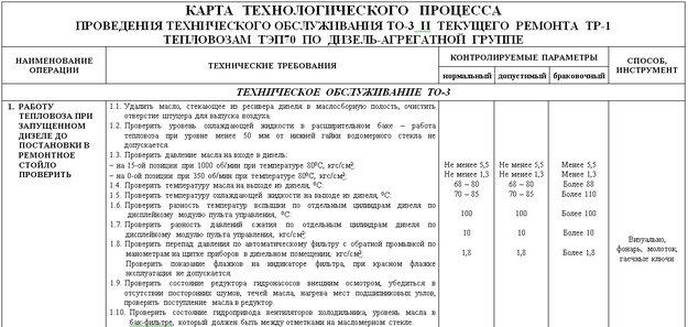 - разработка шаблона технологической карты технического обслуживания ТО-3 и текущего ремонта ТР-1 тепловоза - в данном разделе предлагаются варианты нового шаблона карты технологического процесса ТО-3 и ТР-1 тепловоза.