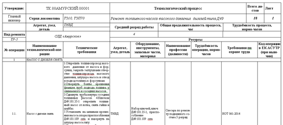 - разработка шаблона технологической карты ремонта оборудования на примере участка по ремонту топливной аппаратуры тепловозных дизелей - в данном разделе предлагаются варианты нового шаблона карты технологического процесса ремонта форсунки дизеля Д49, с переработанной информацией по ремонту.