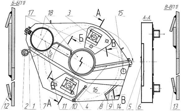 КЗП состоит из кронштейна 1, находящегося на торцевой стенке нижней половины кожуха, с резьбовым соединением и эксцентриковой втулкой 2, установленный с возможностью перемещения, на внутренних стенках кожуха нижней и верхней половин имеются две бобышки 3, 4, с эксцентриковыми гайками, лабиринт верхней 5 и нижней 6 частей кожуха (А – А) для сбора и возврата масла, который установлен внутри кожуха, маслоотбойные пластины 7, 8, 9, расположенные внутри кожуха, и лабиринтную систему линий разъема 10, 11 верхней и нижней частей кожуха, стоки 12, 13, (Б – Б) и (В – В), отстойник 14 загрязненного масла, расположенный на днище внутри кожуха под заливочным отверстием 15, в нижней части установлен щуп 16 для контроля уровня масла, а для сочленения верхней и нижней частей кожуха имеются сочленяющие планки 17 с крепежными болтами, при этом в стенках кожуха выполнены три круглых отверстия 18, два из которых с уплотнителем 19, причем все уплотнители выполнены из маслобензостойкой резины, а стоки 12, 13 расположены под отверстиями 18.