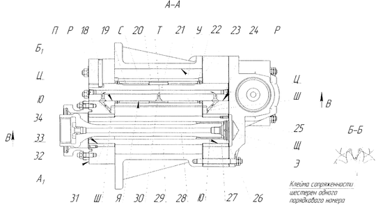 1 – корпус насоса; 2, 4, 6, 12 – прокладки; 3 – крышка наружная; 5 – фланец; 7 – пробка; 8 – пробка (для замера давления нагнетания); 9 – поршень клапана; 10 – корпус клапана; 11 – пружина клапана; 13 – пломба; 14 – кольца регулировочные; 15 – крышка; 16 – крышка внутренняя; 17 – втулка центрирующая; 18 – штифт фиксирующий ось; 19, 27, 31 – втулки подшипников скольжения; 20 – втулка промежуточная; 21 – ось ведомой шестерни – неподвижная; 22 – кольцо промежуточное; 23, 25, 32 – кольца стопорные; 24 – винт-заглушка; 26 – упор приводного вала; 28 – вал приводной; 29 – шестерня ведущая; 30 – шестерня ведомая; 33 – кольцо ограничительное, 34 – штуцер упорный; 35 – рым-болт; 36 – заглушка; 37 – пластина декоративная; 38 – пластина стопорная; 39 – штифты центрирующие; А – полость нагнетания насоса; Б – окно перепуска из полости нагнетания в клапан; В – полость клапана надпоршневая; Д – полость нагнетания клапана; Е – отверстия поршня клапана; Ж – щели клапана; К – окно перепуска из клапана во всасывающую полость насоса; Л – полость всасывания насоса; М – расточки под резиновые кольца; Н – поверхность посадочная (центрирующая); П, Т. Б1 – отверстия подвода масла в оси; Р – поверхности отверстий для оси; С – лыска оси; У – поверхность расточек корпуса, Ц – отверстия подвода масла в крышках; Ш – каналы подвода масла; Щ – отверстия упора; Э – полость подвода масла к приводному валу; Ю, Я – поверхности подшипников скольжения; A1 – плоскость сопряжения внутренней крышки и втулки; B1 – полость насоса (не используется)