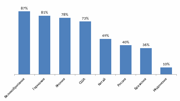 Уровень проникновения Интернет-покупок (процент пользователей сети, которые отовариваются онлайн), в Соединенных Штатах составляет 73%, в Китае – 49%. Самый высокий показатель из числа исследуемых стран в Великобритании (87%), самый низкий – в Индонезии (9,5%). В России уровень проникновения онлайн торговли равен среднему по миру – 40% (рисунок 3).