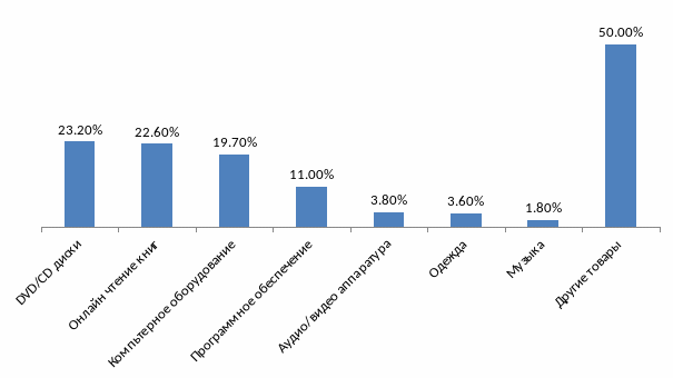 По данным социологических опросов, наибольшая доля приходится на покупку DVD/CD дисков – свыше 23%, а также на онлайн чтение книг – 22,6%. Более подробная структура представлена на рисунке 4.