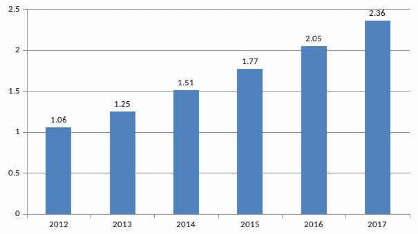 По оценкам зарубежных экспертов агентства «eMarketer’s» в 2013 году внешняя торговля достигла отметки в 1,251 триллион долларов, увеличившись по сравнению с предыдущим годом на 18,3%. В 2014 году оборот Интернет-покупок составил 1,51 триллиона долларов. Интернет-торговля в соответствии с ожиданиями экспертов продолжит набирать обороты дальше, на рисунке 1.1 представлен прогноз её развития до 2017 года [1].