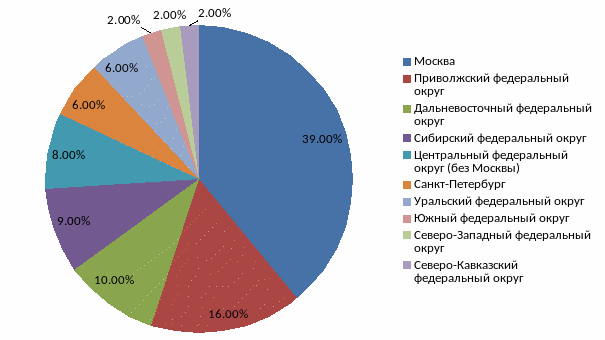 Среди регионов по числу заказов лидирует Москва (на неё приходится около 40% всех Интернет-заказов России). На Приволжский федеральный округ приходится 16%, и третье место занимает Дальневосточный округ, что позволяет сделать вывод о перспективах развития (рисунок 7) [1].