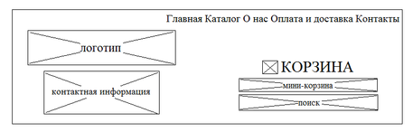 Так как шапка у всех страниц одна, поэтому, целесообразно важную информацию выносить в этот элемент разметки. Шапка данного магазина содержит логотип, контактные телефоны, контактный Email, вспомогательное меню, переход в корзину, мини-корзину, поиск по товару.