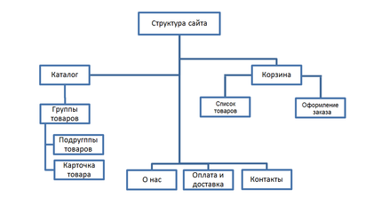Структура сайта в Интернет-магазинах обычно не сложная. Чаще всего она делится на две группы: каталог и вспомогательные разделы [14]. Для магазина «Строймаг» разработана структура сайта, представленная на рисунке 3.4. Во вспомогательном меню представлены разделы для покупателей, которые помогают принять решения: «О нас», «Оплата и доставка», «Контакты». Пункт меню «О нас» обязательно должен быть, чтобы новый покупатель мог узнать больше о продавце и проникнуться доверием. К группе каталога можно отнести страницу «Каталог», страницы групп и подгрупп товаров из каталога. Уникальными являются страницы «Главная», «Корзина» и карточка товара.