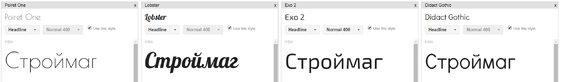 В данном магазине используются четыре шрифта без засечек (рисунок 3.12): Exo 2 (информация в шапке и подвале сайта, на вспомогательных страницах, дополнительная информация о товаре), Didact Gothic (меню, информация о товаре), Lobster (хлебные крошки, описание магазина в подвале сайта, некоторая информация в корзине), Poiret One (логотип и информация в промо-блоке).