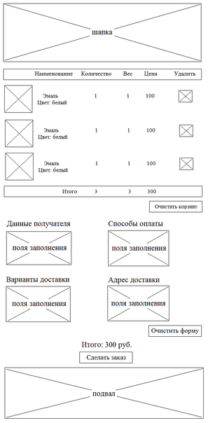 Информация на странице корзины специфична. Она содержит не только данные о выбранных товарах, но и поля для оформления заказа. Поля для оформления в данном магазине следующие: