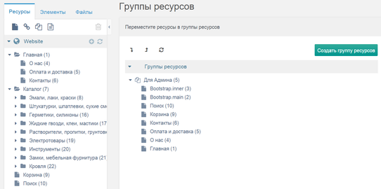 Настройка подобных прав проходит в несколько этапов. Первый этап – создание группы ресурсов, которые не должны быть доступны менеджеру. На рисунке 3.22 показаны ресурсы сайта, доступные только администратору.