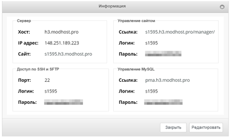 Информация по доступу к базе данных, управлению сайтом, серверу и другому показана на рисунке 3.15.