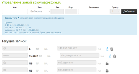 Необходимо настроить связь сайта и доменного имени. Для этого нужно настроить DNS (Domain Name System), систему доменных имен. Обычно ее используют для получения IP-адреса по имени хоста. Требуется настроить всего одну запись типа А, тогда при обращении к stroymag-store.ru запрос уйдет на адрес хоста (рисунок 3.16).