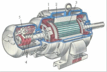 1 - станина, 2 - обмотка статора, 3 - ротор, 4 - контактные кольца,