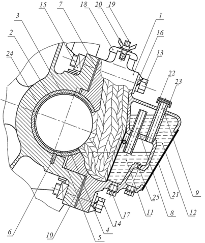 Рисунок 2.1 – Моторно-осевой подшипник электровоза 2(3)ЭС5К: 1 – букса; 2 – вкладыш; 3 – антифрикционный слой вкладыша; 4 – вкладыш с окном; 5 – антифрикционный слой вкладыша с окном; 6 – шпонка; 7 – прокладка; 8 – сообщающая трубка; 9 – заправочная трубка; 10 – подбивочная камера для кос (а); 11 – рабочая камера (б); 12 – запасная камера (в); 13 – болт верхний; 14 – болт нижний; 15 – гайка; 16 – планка фиксирующая; 17 – болт сливной; 18 – крышка; 19 – болт шарнирный; 20 – гайка; 21 – пластина; 22 – крышка; 23 – прокладка; 24 – остов; 25 – заправочное отверстие.