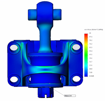 Критерий Мизеса (критерий энергии формоизменения) определяет момент исчерпания несущей способности сравнением величины эквивалентного напряжения с пределом текучести материала. Критерий Мизеса применим для изотропных материалов, имеющих вязкий характер разрушения, к ним относится большинство металлов. Расчет эквивалентных напряжений, при статической нагрузке от веса двигателя, показывает, что в деталях узла крепления ТЭД к раме тележки возникают следующие напряжения: втулка – 14,8 МПа; валик – 21,7 МПа; нижняя шайба – 24,6 МПа; нижняя шайба – 27,6 МПа; нижний диск – 29,3 МПа; верхний диск – 44,9 МПа; кронштейн – 63,3 МПа; подвеска – 71,9 МПа; гайка – 76,4 МПа. Данные статического анализа приведены в таблице 5.1. Эпюра напряжений показана на рисунке 5.5. Согласно результатам расчета, максимальное напряжение в гайке, возникающее в месте ее контакта с диском, составляет 95 MПa, предел текучести для материала сталь 45, из которого изготовлена деталь, составляет 580 МПа, следовательно, напряжения не представляют опасности, конструкция обеспечивает запас по прочности и является работоспособной.