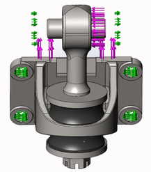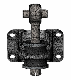 Для получения расчетных данных, закрепление модели, направление действия силы и контактные условия между компонентами модели принимают аналогично условиям, заданным при расчете узла крепления ТЭД под весом двигателя. Величина силы от действия максимального тягового момента была рассчитана в пункте 3, она принимается равной 64,41 кН, так как реакция от действия тягового момента действует совместно с весом двигателя.