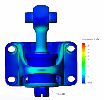 Расчет эквивалентных напряжений, при статической нагрузке от максимального тягового момента, показывает, что в деталях узла крепления ТЭД к раме тележки возникают следующие напряжения: втулка – 52,9 МПа; валик – 64,8 МПа; верхняя шайба – 101 МПа; подвеска – 110 Мпа; нижняя шайба – 114 МПа; верхний диск – 136 МПа; гайка – 143 МПа; кронштейн – 210 МПа; нижний диск – 213 МПа. Данные статического анализа приведены в таблице 5.2. Эпюра напряжений показана на рисунке 5.8. Согласно результатам расчета, максимальное напряжение возникает в нижнем диске и составляет 213 MПa, предел текучести для материала сталь 3 пс, из которого изготовлена деталь, составляет 215 МПа, следовательно, напряжения в диске представляют опасность, так как деталь почти достигла своего предела текучести.
