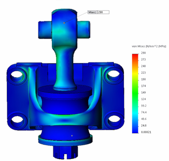 Расчет эквивалентных напряжений при статической нагрузке от максимального тягового момента, во время прохождении кривого участка пути, показывает, что в деталях узла крепления ТЭД к раме тележки возникают следующие напряжения: верхняя шайба – 101 МПа; валик – 115 МПа; нижняя шайба – 128 МПа; гайка – 148 МПа; верхний диск – 148 МПа; нижний диск – 214 МПа; кронштейн – 215 МПа; подвеска – 260 МПа; втулка – 298 МПа. Данные статического анализа приведены в таблице 5.3. Эпюра напряжений показана на рисунке 5.8. Согласно результатам расчета, максимальное напряжение возникает во втулке и составляет 298 MПa, предел текучести для материала сталь 110г13л, из которого изготовлена деталь, составляет 360 МПа, следовательно, напряжения не представляют опасности, конструкция обеспечивает запас по прочности и является работоспособной.