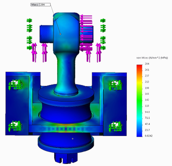 Расчет эквивалентных напряжений при статической нагрузке от максимального тягового момента, во время прохождении кривого участка пути, показывает, что в деталях узла крепления ТЭД к раме тележки после модернизации возникают следующие напряжения: валик – 129 МПа; верхняя шайба – 135 МПа; гайка – 140 МПа; верхний диск – 145 МПа; нижняя шайба – 152 МПа; нижний диск – 205 МПа; подвеска – 252 МПа; кронштейн – 262 МПа; втулка – 284 МПа. Данные статического анализа приведены в таблице 5.4. Эпюра напряжений показана на рисунке 5.5. Согласно результатам расчета, после модернизации максимальное напряжение возникает во втулке и составляет 298 MПa. Как видно из результатов анализа после модернизации, коэффициент запаса составил 2,21, т.е. напряжения не представляют опасности, конструкция обеспечивает запас по прочности и является работоспособной. Коэффициент запаса для нижнего диска после модернизации составляет 2,82, т.е. данная деталь также является работоспособной.