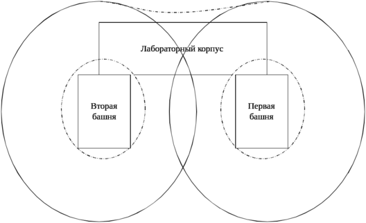 Зоны покрытия молниеотводов лабораторного корпуса представлены на рисунке 4.6.