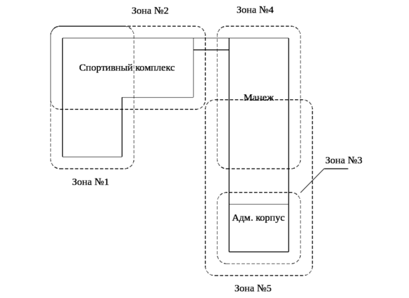 Здания спортивного комплекса разбиваются на 3 зоны защиты: