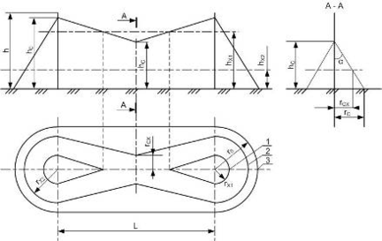 Зона защиты двойного стержневого молниеотвода с указанием размеров приведена на рисунке 4.5.