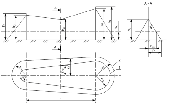 Габаритные размеры торцевых областей зон защиты h01, h02, r01, r02, rx1, rx2 определяются по тем же формулам, что и для зон защиты обоих типов одиночного стержневого молниеотвода.