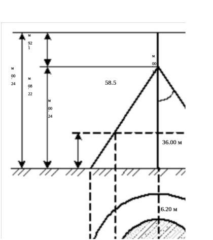 Зона защиты одиночного стержневого молниеотвода с указанием размеров приведена на рисунок 4.11.