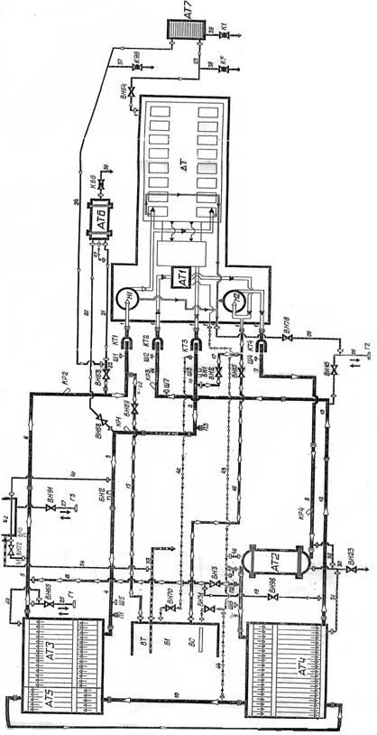 Вода «холодного» контура, охлажденная в двух радиаторах – АТ4, расположенном с правой стороны холодильной камеры, и АТ5, расположенным с левой стороны, по трубопроводу 12, 13 14 поступает в охладитель наддувочного воздуха АТ1. Забрав тепло от наддувочного воздуха центробежным водяным насосом «холодного» контура вода нагнетается в трубопровод 7, 8 , идущий к маслоохладителю АТ2. Из маслоохладителя по трубе 9 поток воды подходит к радиаторам АТ4 и АТ5.