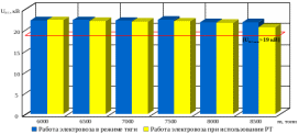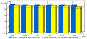 Как видно из рисунков Г.1 и Г.2, при увеличении массы поезда видно, что значения напряжения в тяговой сети уменьшаются. Изменение напряжения в тяговой сети наиболее ярко выражено при применении РТ, по сравнениюс работой электровоза в режиме тяги. Так, при ведении поезда массой в 8,5 тысяч тонн при применении РТ минимальное напряжение в тяговой сети уменьшилось на 1,62 кВпо сравнениюс поезда массой в 6 тысяч тонн, когда при таких же условиях при ведении поезда в режиме тяги минимальное напряжение в тяговой сети уменьшилось на 0,43 кВ. При ведении поезда массой в 8,5 тысяч тонн при примененииРТ среднее трёхминутное напряжение в тяговой сети уменьшилось на 1,32 кВ в отличие от поезда массой в 6 тысяч тонн, когда при таких же условиях при ведении поезда в режиме тяги среднее трёхминутное напряжение в тяговой сети уменьшилось на 0,27 кВ. Однако, рассчитанные значения минимального и среднего трёхминутного напряжений в тяговой сети при межпоездном интервале в 19 минут для двух режимов ведения поезда в разных весовых категориях остаются в пределах, указанных в ПУСТЭ-97 [17]. Таким образом, призаданном ГДП осуществить пропуск поездов с весами от 6 до 8,5 тысяч тонн на участке Анисимовка – Фридман возможно.