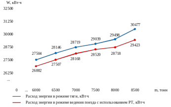 Как видно из рисунка Е.3, с увеличением массы поезда увеличивается, и расход энергии на участке Анисимовка – Фридман. При межпоездном интервале в 19 минут расход энергии на участке в режиме ведения поезда с использованием РТ в среднем на 2,4% меньше, чем у поезда, работающего в режиме тяги. Отсюда следует, что экономия на расход энергии при ведении поезда с использованием РТ в отличие от работы электровоза в режиме тяги может составить в среднем 499800 кВт·ч в месяц.