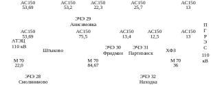 Как следует из рисунка 2.4, на участке Смоляниново – Находка Владивостокского отделения ДВЖД расположены следующие тяговые подстанции: Смоляниново (ЭЧЭ-28), Анисимовка (ЭЧЭ-29), Фридман (ЭЧЭ-30), Партизанск (ЭЧЭ-31) и Находка (ЭЧЭ-32). Питание ТП осуществляется от Артемовской ТЭЦ (АТЭЦ) и Приморской государственной районной электростанции (ПГРЭС), которые являются двумя независимыми источниками питания.