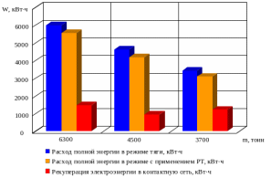 Как следует из рисунка 3.7, потребляемая ЭПС энергия зависит от режима ведения и массы поезда. На участке Анисимовка – Фридман потребляемая энергия поездом массой 6300 тонн, работающим в режиме тяги на 7,23 % больше, чем у поезда, работающего в режиме с использованием РТ. Также электровоз, работающий в режиме с применением РТ, вернул в сеть электроэнергию в размере 1463,1 кВт·ч, что составляет 23,6 % потребленной им энергии. Эти два фактора говорят о значительной экономии ЭЭ. Помимо этого стоит отметить, что потребляемая полная энергия поездом массой 6300 тонн на 22,9 % больше, чем поездом массой 4500 т., следующих в четном направлении.