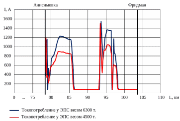 Как следует из рисунка 3.6, с увеличением массы поезда увеличивается и ток ЭПС. Помимо этого видно, что на всём пути участка электровоз, работающий в режиме рекуперации, потребляет ток. Также стоит отметить, что электровоз потребляет значительный ток при движении в подъём. Это характерно для всех поездов различной массы, рассмотренных раннее, движущихся в чётном и нечётном направлениях на участке Анисимовка – Фридман.
