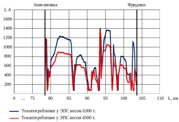 Проанализируем полученные при помощи КОРТЭС зависимости потребления тока ЭПС различной массой на участке Анисимовка – Фридман в режиме РТ. Совместим их на одном рисунке в едином масштабе и представим на рисунке 3.6.
