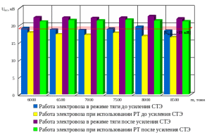 Как следует из таблицы 5.1, в ходе расчётов были заметны малосущественные изменения для таких параметров как коэффициенты перегрузки трансформаторов ТП и эффективные токи контактной подвески. Значения температуры нагрева проводов остались без изменения. Таким образом, усиление СТЭ путём увеличения мощностей устройств поперечной компенсации и дополнительной установки устройств продольной компенсации не влияет на рассмотренные параметры СТЭ, а именно на коэффициенты перегрузки трансформаторов ТП, температура нагрева проводов и эффективные токи контактной подвески кроме уровня напряжения в тяговой сети. Таким образом, применение предложенного варианта включения компенсирующих устройств позволяет добиться приведения уровня напряжения в тяговой сети к нормам, указанным в [17].