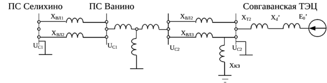 Для расчета динамической устойчивости использована схема Советско-Гаванского энергорайона. Наглядно выбранное сечение можно отобразить на рисунке 4.1 с помощью эквивалентной схемы. При проверке устойчивости системы необходимо выделить точку, в которой замыкание наиболее опасно и для нее провести расчеты.